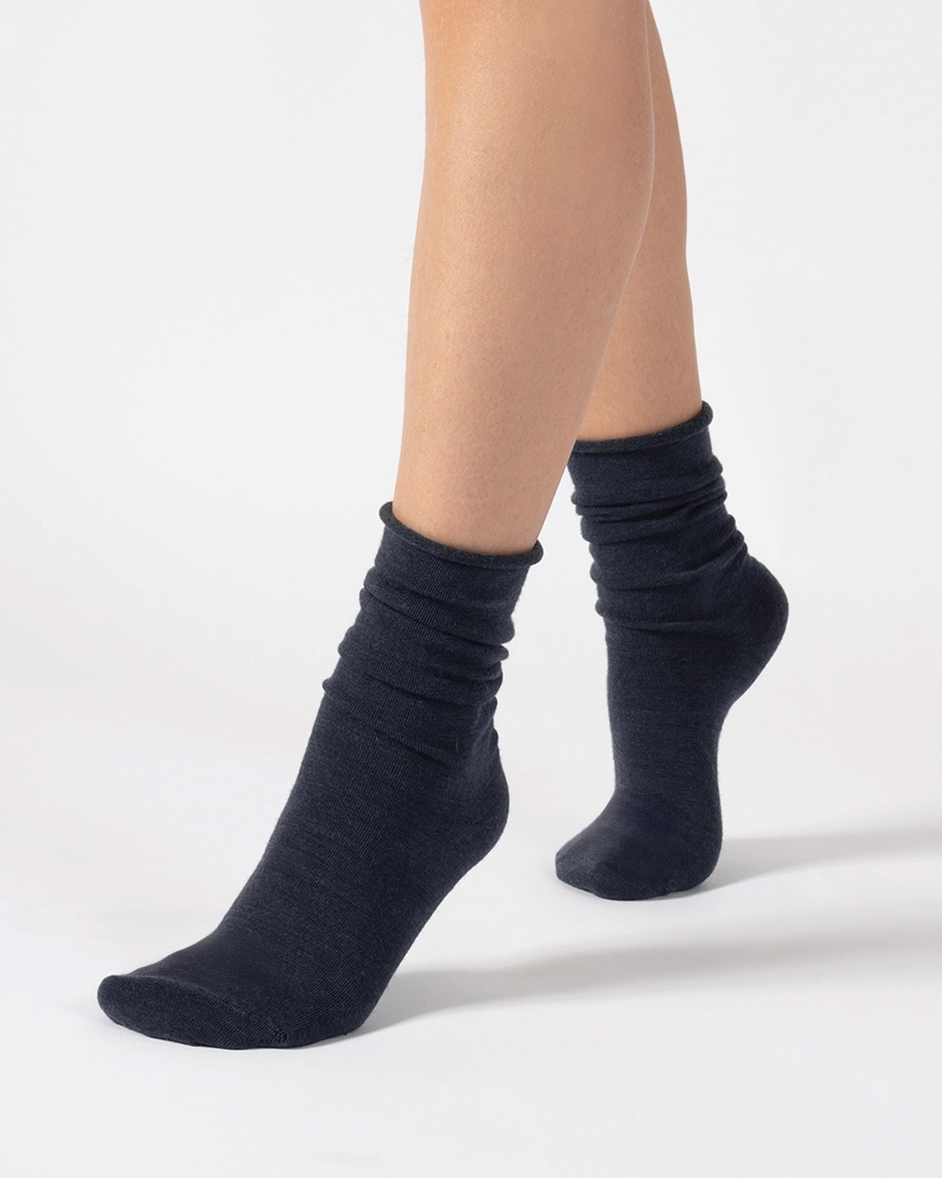 Soft, warm and light weight thermal socks made of merino wool with a soft roll top cuff and flat toe seams.