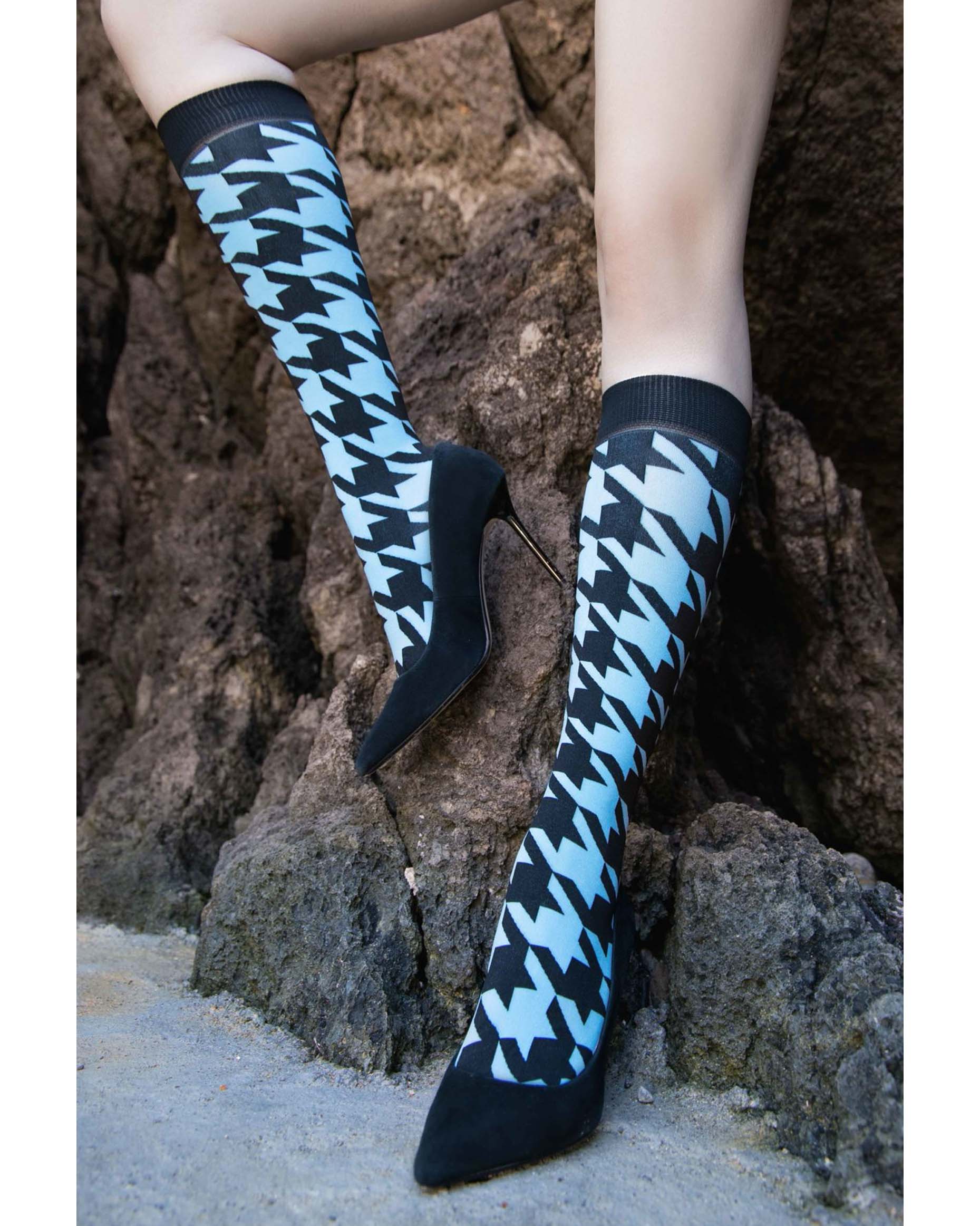 Opaque fashion knee-high socks with a bold and large black houndstooth pattern with contrasting colour and deep comfort cuff.