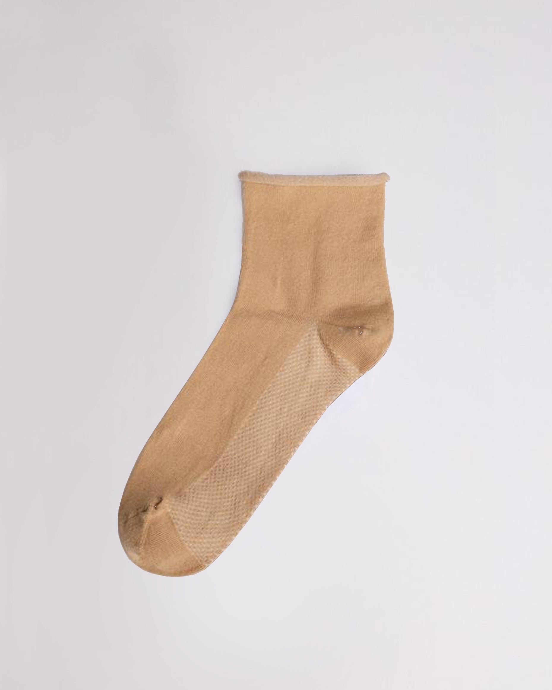 Cotton mix quarter high ankle socks with no cuff roll top and breathable sole.