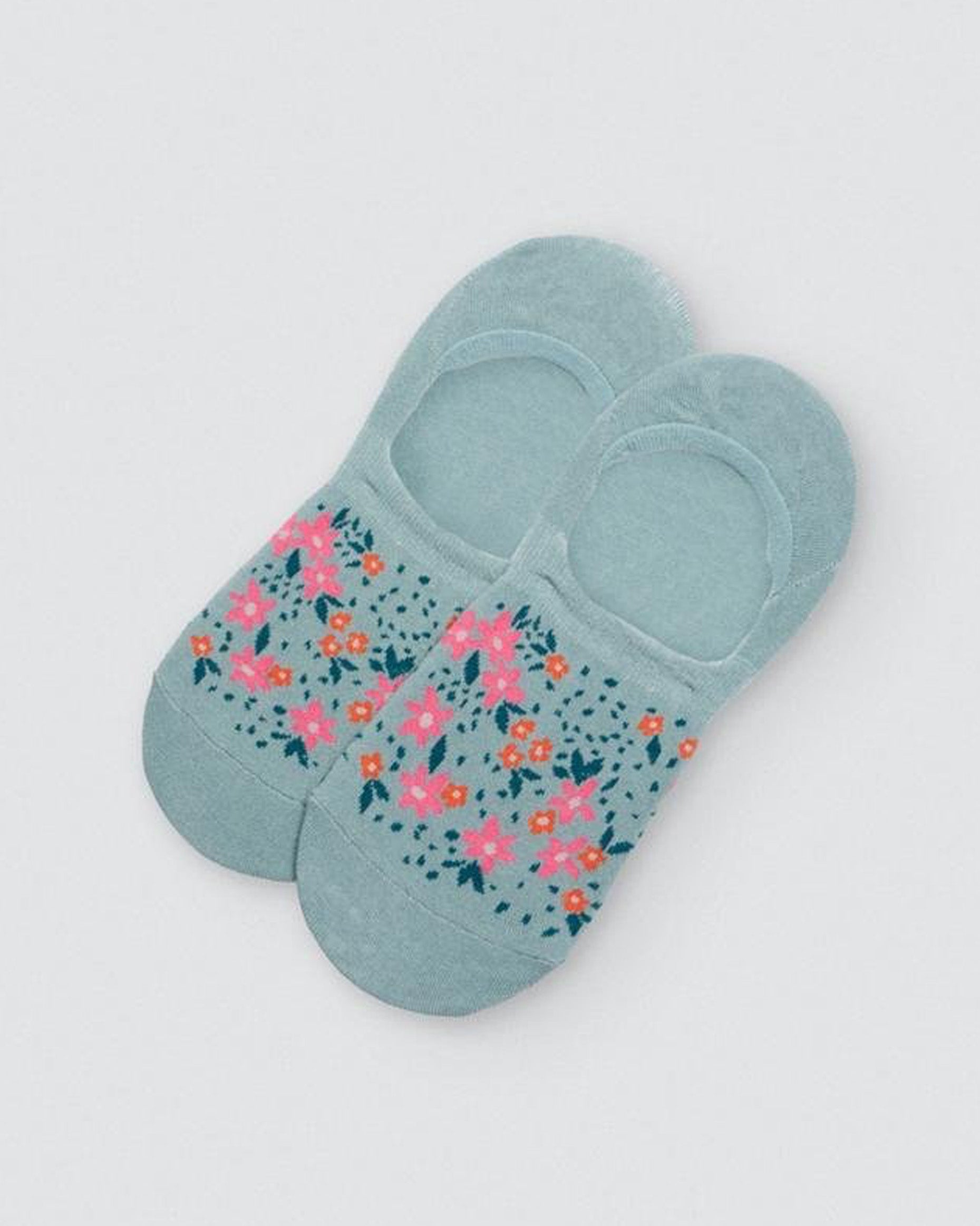 Sage green cotton no show shoe liner footies with a floral pattern in pink, orange and green and three strips of silicone on the heel.